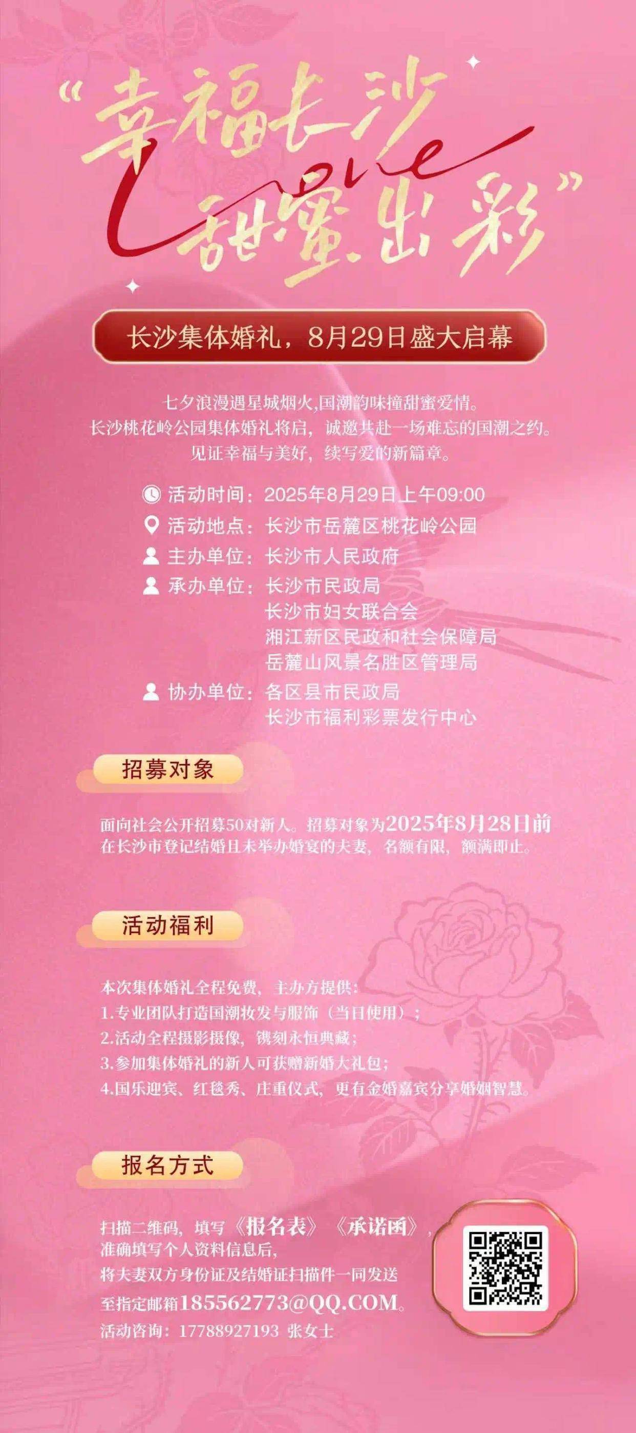 当七夕的浪漫邂逅星城的烟火,当国潮的韵味碰撞甜蜜的爱情,一场浪漫典雅的集体婚礼即将在长沙桃花岭公园盛大启幕。由长沙市人民政府主办的2025年“幸福长沙・甜蜜出彩”七夕集体婚礼将于8月29日在桃花岭公园举办。活动面向全市招募50对在8月28日前登记结婚且未办婚宴的夫妻。现场不仅有国乐迎宾、浪漫红毯秀以及庄重的传统婚礼仪式,还特邀金婚嘉宾分享婚姻智慧。参与的新人将享受专业团队打造的国潮妆发与服饰,并有全程摄影摄像跟拍记录幸福瞬间,还能获得新婚大礼包。