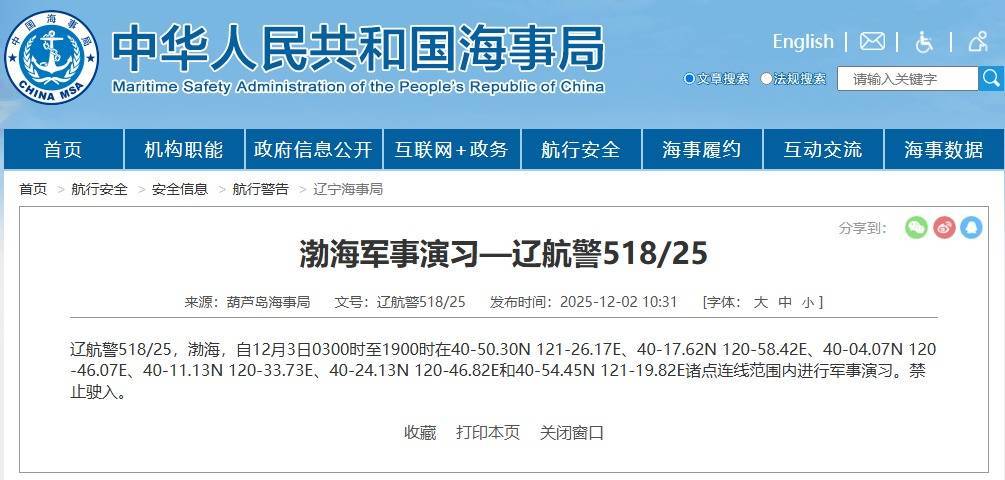 葫芦岛海事局发布航行警告,12月3日3时至19时,渤海部分海域进行军事演习,禁止驶入。