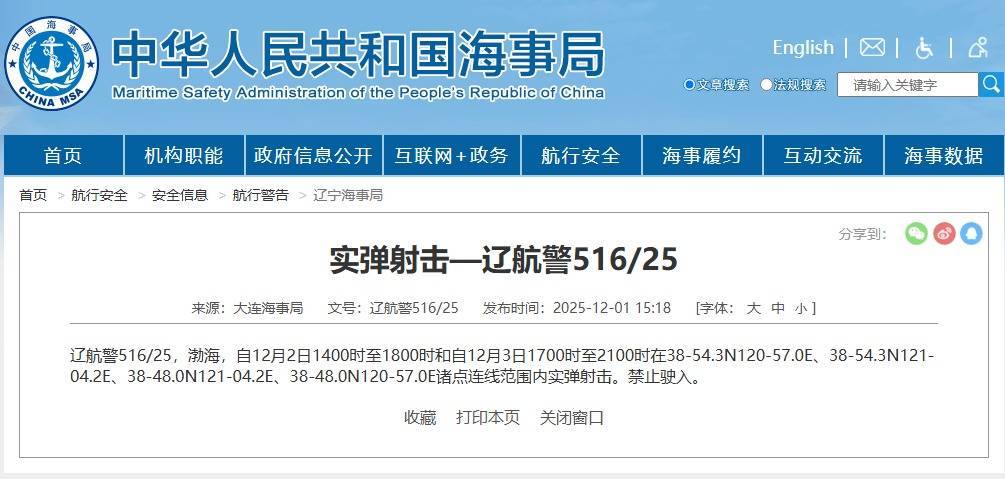 央视网消息:据中国海事局网站消息炒股配资网站有,大连海事局发布航行警告,12月2日14时至18时、12月3日17时至21时,渤海部分海域进行实弹射击,禁止驶入。